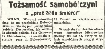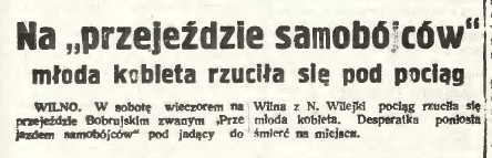 Słowo, Nr. 307, 7 ноября 1938 года. Сообщение об одном из многочисленных самоубийств на железной дороге. Молодая женщина бросилась под поезд из Новой Вилейки в Вильно, погибла на месте. Как отмечает газета, переезд на улице Бобруйской в Вильне (как она сейчас называется?) называли "переездом самоубийц".