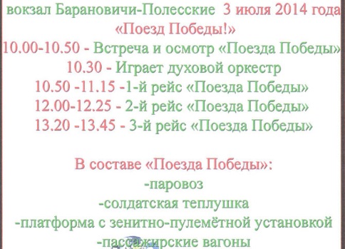viewtopic.php?p=58355#p58355dmitro писал(а): В честь 70-летия освобождения Беларуси от немецко-фашистских захватчиков 3 июля в Барановичах будет курсировать специальный «Поезд Победы» на паровозной тяге. Данный проект организован Барановичским отделением Белорусской железной дороги.