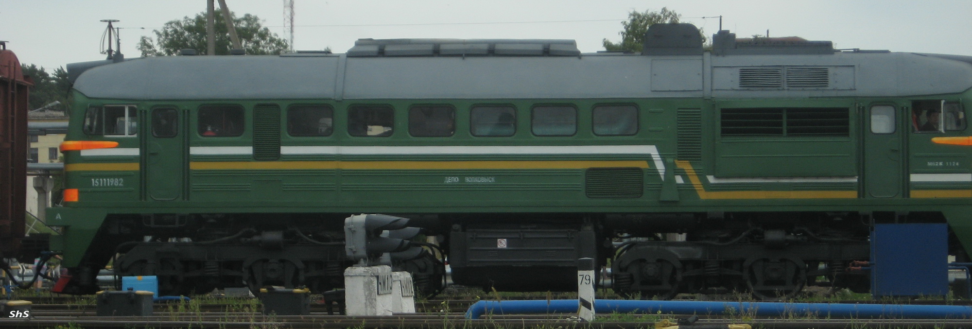 Съездил специально в Волковыск и после перекура в пару часов получилось его словить. Прибыл с не большим составом со стороны Мостов. Снять смог только из далека, да и темновато было, поэтому за качество фоток извиняйте, но номер М62К-1124, "восьмикод" 15111982 и приписка депо Волковыск на фото читаются. "Морда лица" как у ДМ62 (кроме ящика под номером), тележки как у обычной Машки. Что за гибрид?