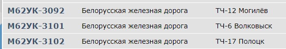 Наблюдал я значицца сегодня в обед картину. О.п. Курасовщина, в сторону баранович проехал М62 на бесчелюстных тележках (Аля минские ДМ62) но на борту красовалась надпись "депо Полоцк", через пять минут из баранович проехал точно такой же, только с надписью "депо Могилев". Номера я соответственно не рассмотрел... Подскажите кто ведает, что это за удивительные М62 коих в природе небыло в этих депо???