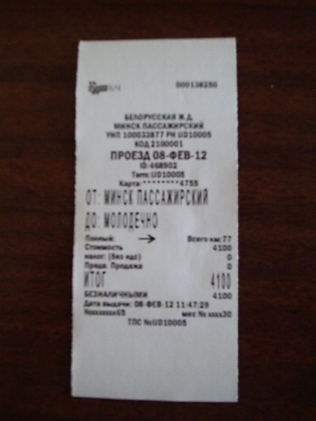 Опробовал покупку билета на пригород через терминал. Прикольно. Очередей нет, видимо, народ пока побаивается. Выбираешь станцию, а он тебе маршрут предлагает. От Минска до Молодечно кроме прямого предложил Минск-Пассажирский - Барановичи-Полесские - Лида - Молодечно :lol: Билет подлиннее обычного, фото прилагаю (правда, размытое, но что ж сделаешь).
