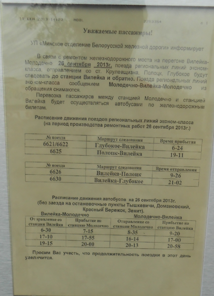 Про электричку на 18.35 в Молодечно пока ничего не написано. Есть про дизель и расписание автобусов до Вилейки 26-го числа.