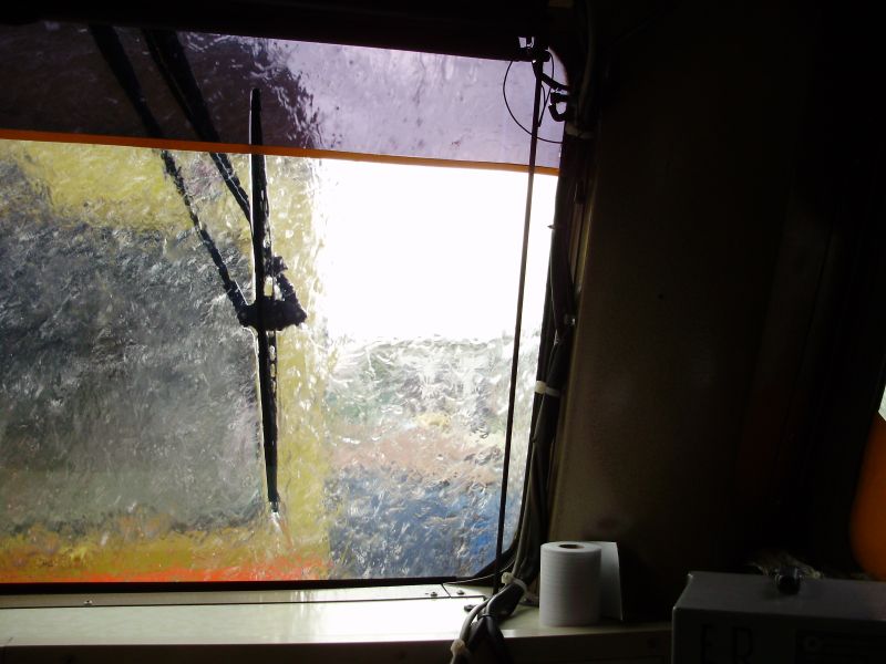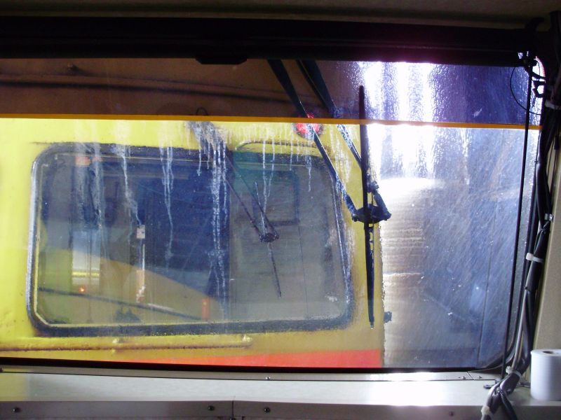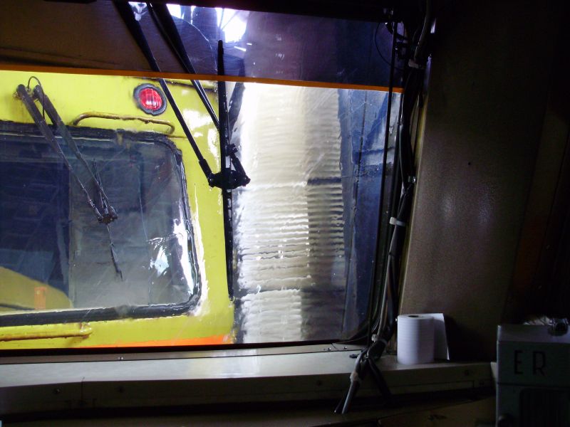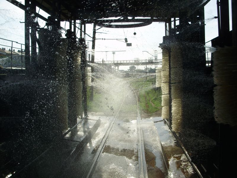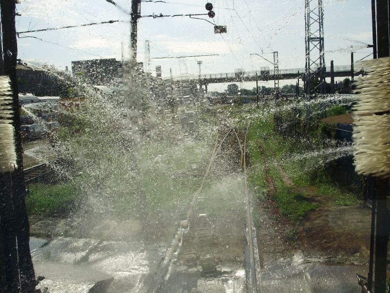 На мойке нет контактного провода, поэтому проезжаем через мойку с опущенными токоприёмниками по принципу тяни-толкая. Сегодня я был во втором составе. Первый состав опустил токоприёмники и я его заталкивал на мойку из второго состава, машинист же первого состава только управлял тормозами. После того, как я его протолкал через мойку на противоположную сторону, машинист первого состава поднял свои токоприёмники, а я на втором составе опустил свои. И машинист первого состава протащил меня через мойку.