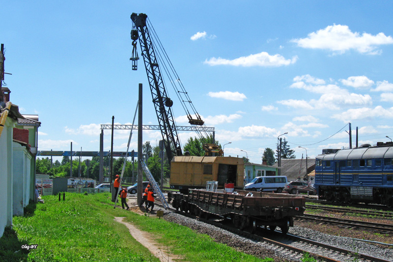 К 20.30 как минимум 2 поперечины установили. Еще добавилось 7-10 опор возле Полесского путепровода со стороны Жлобина (примерно там, где др1 выезжают с разворота на вокзал). Еще собирались работать на Четном (проезжал ЧМЭ3 с трактором ,буром и стаканами). Стало известно, что работают и ночью 8) .