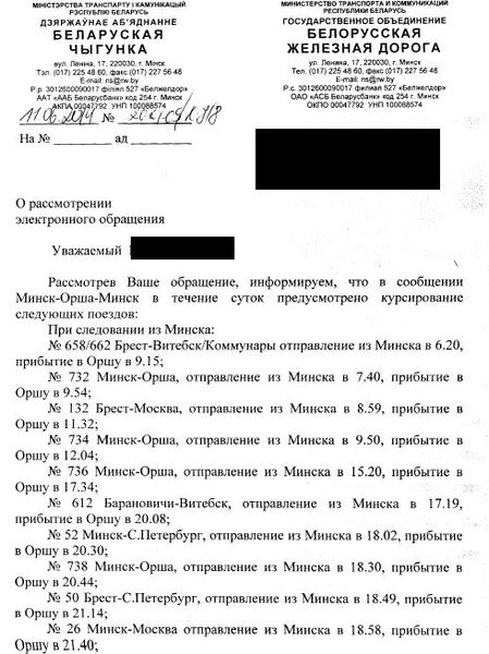 Пришел ответ по поводу стоянки по Орше поезду Минск-Витебск.