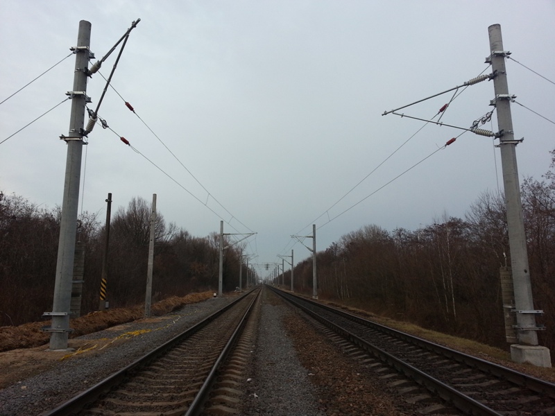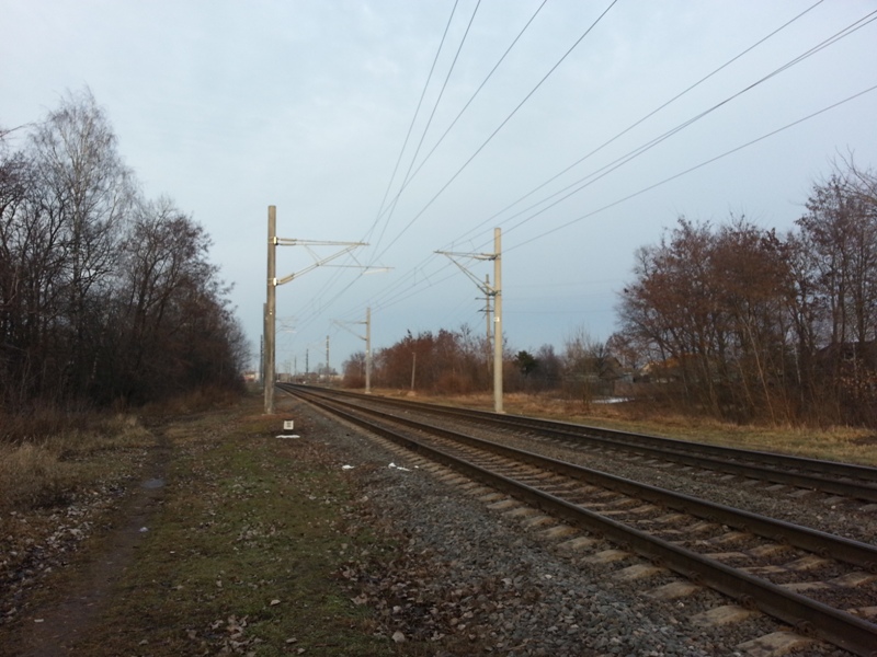 Сам путь на парк Буг сейчас от вокзала выгнулся ближе к пункту перестановки. Похоже, что на евроколее там появится 2 электрифицированных тупика, именно ради них и выгнули главный путь, чтобы место освободить (только х.з. для чего там эти тупики, но заготовки КС для этих тупиков уже висят, а самих тупиков можно сказать ещё практически нет). Как я понял, переэлектрификацию и замутили только потому, что делают полную переделку в путевом развитии, а дальше пункта перестановки к парку Буг электрификация судя по всему останется старой. На данный момент электрификация главного пути 1435 мм внешне завершена на всём протяжении переделок (см. фото №1), лишь на стыке новой и старой электрификации сейчас висят изолятор на контактном проводе и изолятор на несущем тросе и висит табличка "Конец контактной подвески". Поезда из Польши по-прежнему заталкиваются на вокзал при помощи ЧМЭ3 и при помощи его же заводятся до парка Буг.