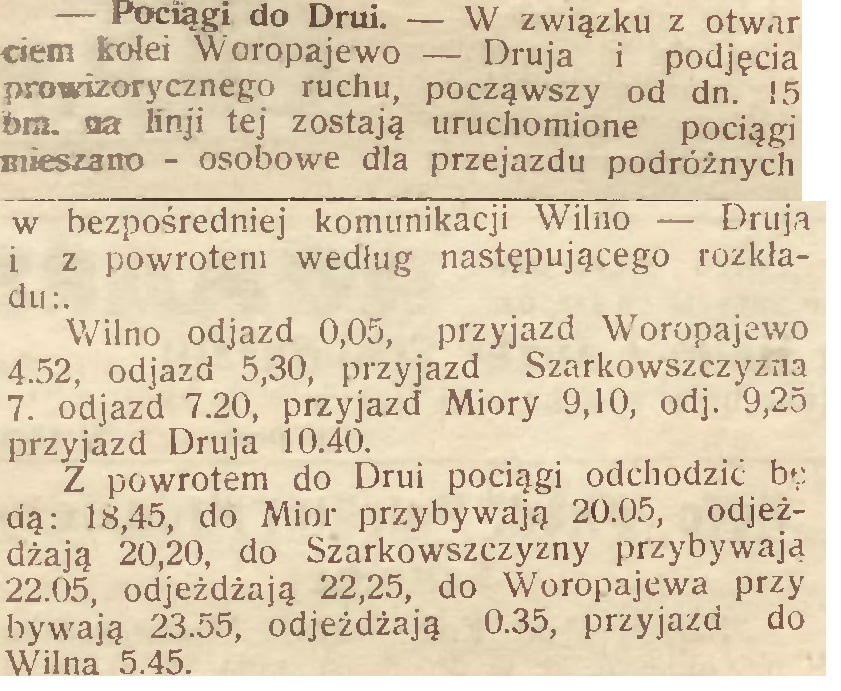 Пасля адкрыцця лініі Варапаева - Друя, з 15 лістапада 1932 г. пачаўся рух цягніка Вільня - Друя з наступным раскладам: