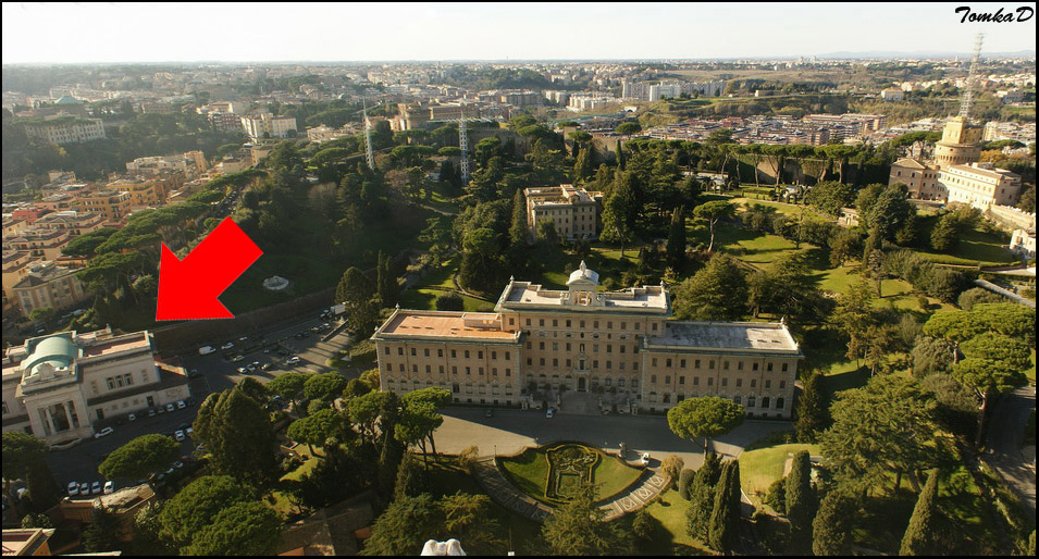 А вот и железнодорожный вокзал (отмечен красной стрелкой). Справа от него, там где припаркованы белые автомобили, находятся пути. Прошу прощения за кривую панораму: я так и не смог растолкать ту тысячу китайцев, плотно засевших на смотровой площадке купола собора Святого Петра.