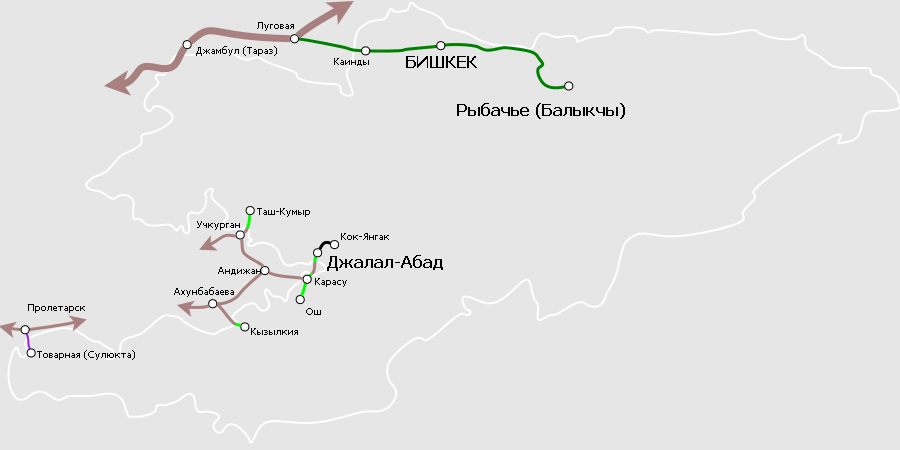 На схеме я акцентировал внимание на Сулюктинской узкоколейке - чтоб чтоб не думали, что в Кыргызстане нет электрифицированных жд ))