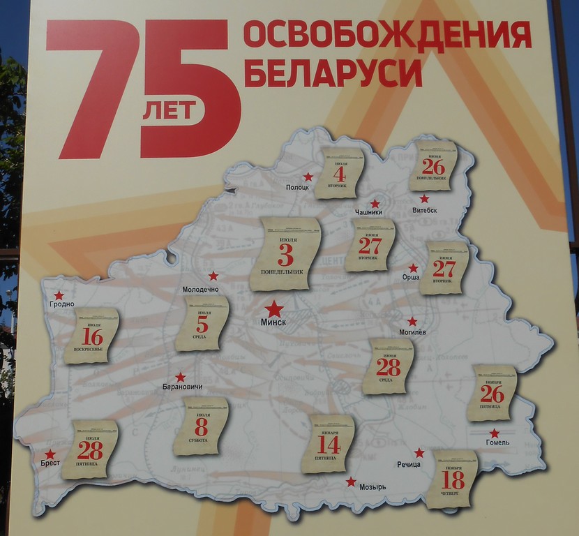 В Минске ещё на заборе у 24 пути повесили листы календаря с датами освобождения крупнейших вокзалов (областные и Барановичи) и эту карту. Выбор городов на ней немного удивляет.