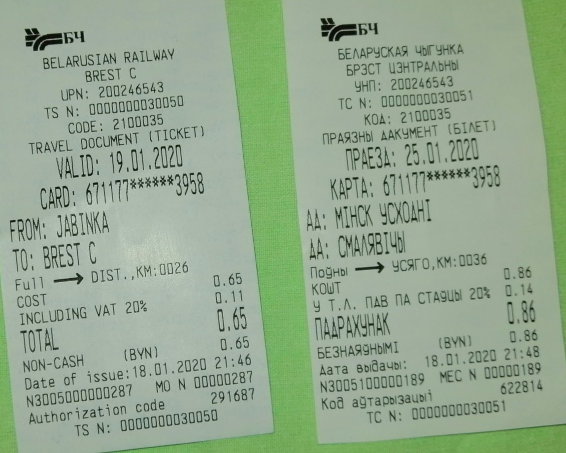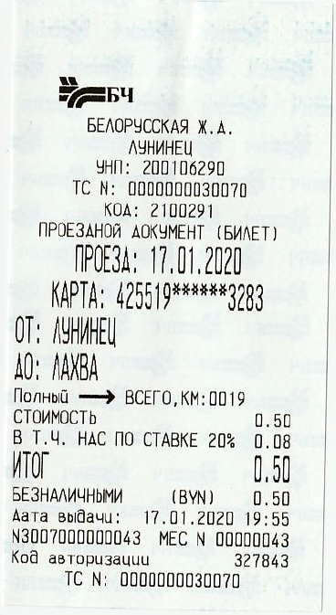 Там на билете вверху после строки с УНП и в самом низу написано "ТС № 00000000300**". Вот эти последние две цифры, которые я звёздочками обозначил, и интересуютValentian писал(а): 11 янв 2020, 19:32 Где номер смотреть? Гляну в Барановичах, тоже поставили новые терминалы