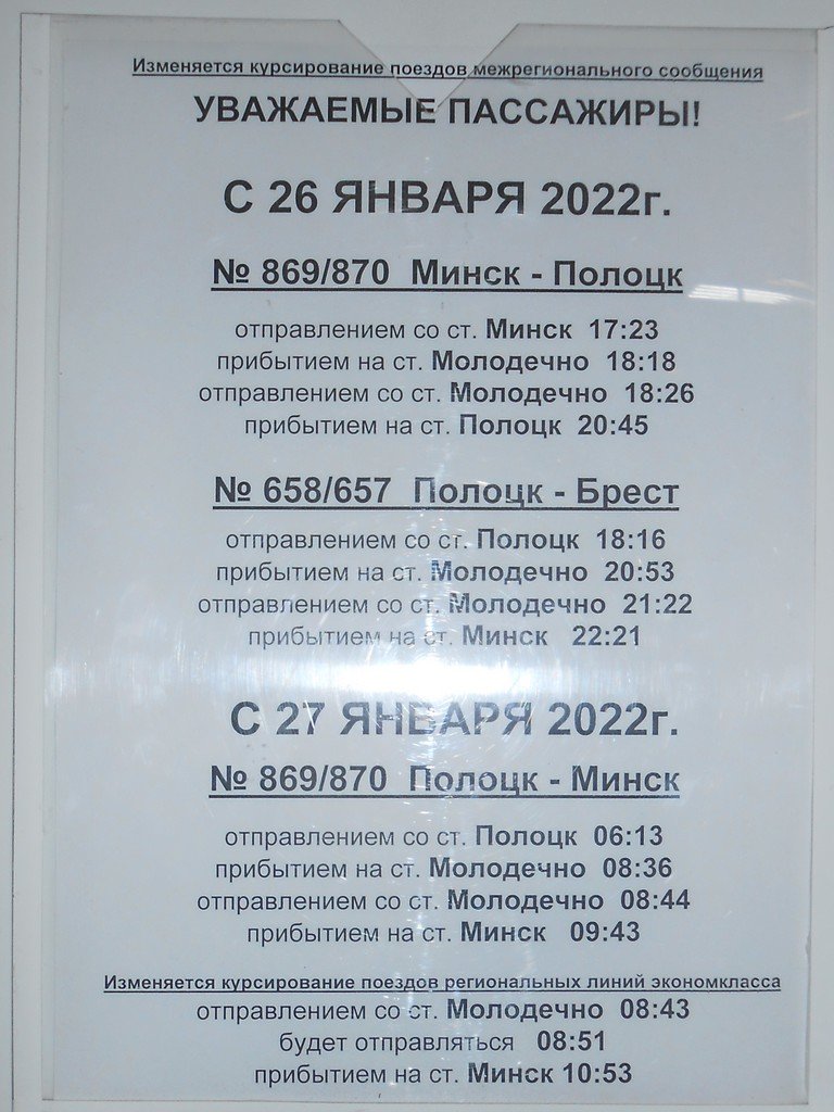 Пока ещё pass.rw.by потихоньку восстанавливается, есть ПДСы, и 870 уже есть без продажи билетов. А пригород можно посмотреть на Яндекс.Расписаниях, и там уже есть новый график 6116. Сдвинули на 8 минут позже, убрав большую стоянку в Радошковичах, а прибытие оставили прежним, оставив пропуск 730 в Ждановичах. А я думал, вернут, как было в прошлом годуVavan писал(а): 22 янв 2022, 01:24https://www.rw.by/corporate/press_cente ... ruet_2022/В связи с предстоящей заменой подвижного состава поездов № 869/870 Минск – Полоцк, сформированных из вагонов локомотивной тяги, на моторвагонный подвижной состав и корректировкой их расписания движения, временно ограничена продажа билетов на эти поезда отправлением из Минска с 26 января 2022 года, из Полоцка с 27 января 2022 года.