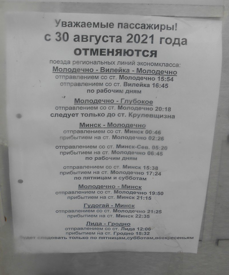https://kraj.by/news/sobitiya/vilejka_m ... 30_avgustaВИЛЕЙКА, МИНСК, ГУДОГАЙ – СМОТРИТЕ, КУДА И В КАКОЕ ВРЕМЯ ВЫ НЕ УЕДЕТЕ ПО ЖЕЛЕЗНОЙ ДОРОГЕ ИЗ МОЛОДЕЧНО ПОСЛЕ 30 АВГУСТА