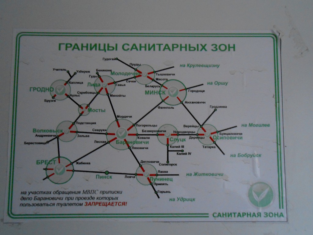 В барановичских ЭР9Е на туалетах заменили минские схемы санитарных зон. Идея в том, что схемы на дизелях и электричках унифицировали. Вместо слова "дизельпоездов" написали "МВПС". А картинка одинаковая. Но забавно видеть схему с Гродно, Лидой, Волковыском, Мостами, Слуцком и Солигорском в электричке