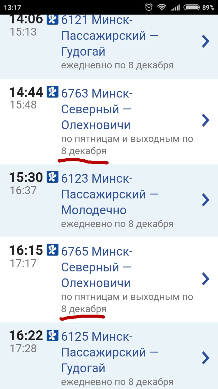 В расписании на сегодня почему-то значатся отмененые с октября электрички до Олехновичей, что вводит некоторых в заблуждение..