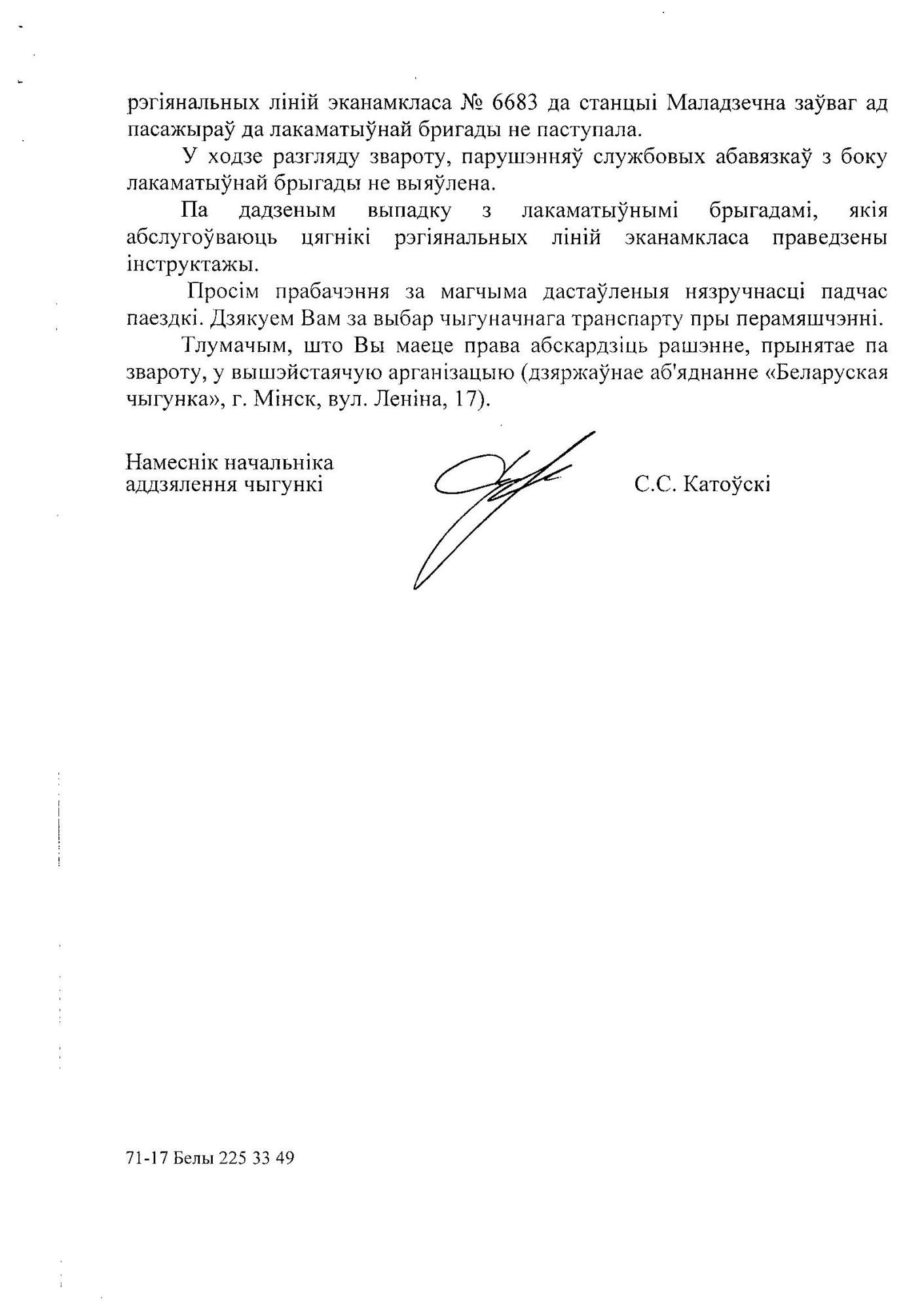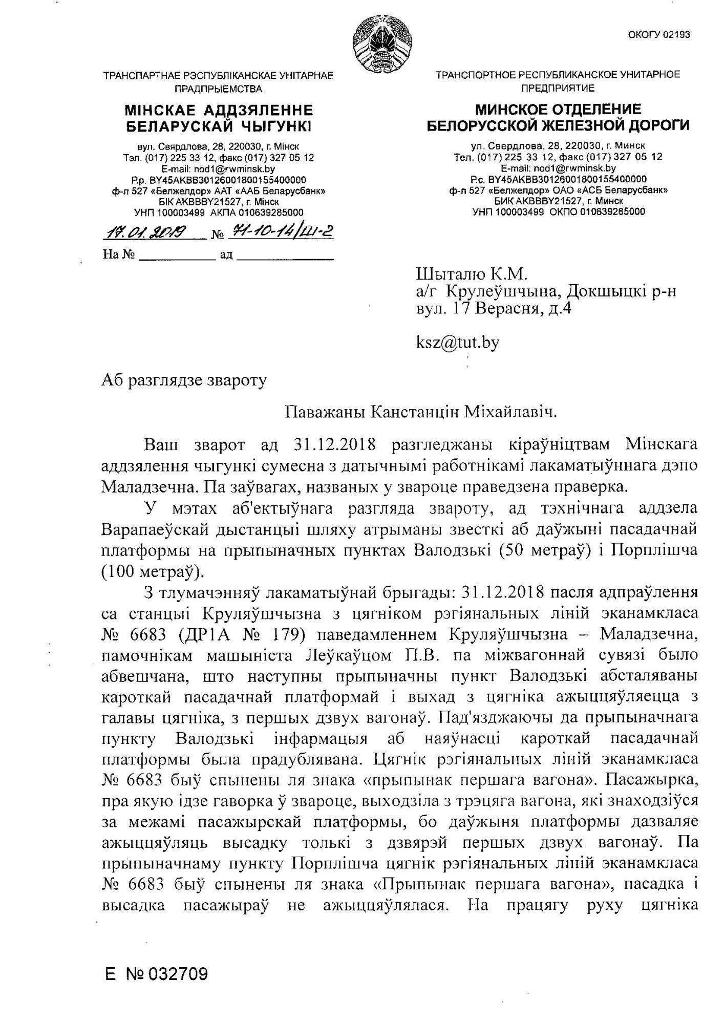 "Паведамляю, што 31 снежня 2018 года лакаматыўная брыгада дызель-цягніка №6683 Крулеўшчына – Маладзечна (цягнік ДР1А-179 прыпіскі ТЧ Баранавічы, брыгада ТЧ Маладзечна), робячы прыпынак на прыпыначным пункце “Валодзькі”, спынілася не каля знака “Остановка первого вагона”, а праехала гэты знак прыкладна на два з паловай вагоны. У выніку гэтага пажылая пасажырка з сумкамі, якая высаджвалася з першых па ходу руху дзвярэй трэцяга вагона, мусіла высаджвацца на зямлю, бо дзверы вагона праехалі пасадачную платформу. Гэтак была створаная небяспечная для пасажыра сітуацыя.