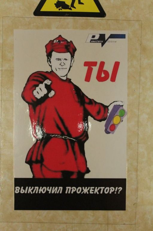 Наш машинист-инструктор, как напоминание выключить прожектор при смене кабин, на двери из служебного тамбура в салон.