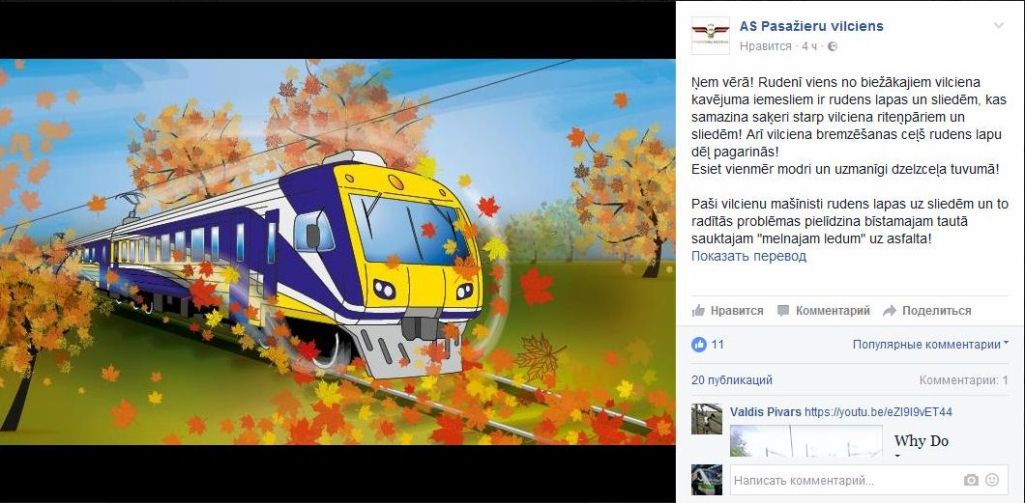 PV и LDz на своих страничках в Фейсбуке предупреждают пассажиров о возможных опозданиях поездов по причине листопада.