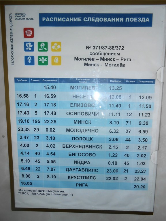 Но ВБСом этот вагон не считается. На сайте МЖА в схеме состава 371-го поезда этот вагон указан как 30 С МОГИЛЕВ 1 ― МИНСК-ПАССАЖИРСКИЙ. Но почему-то в самом вагоне висит такое расписание.