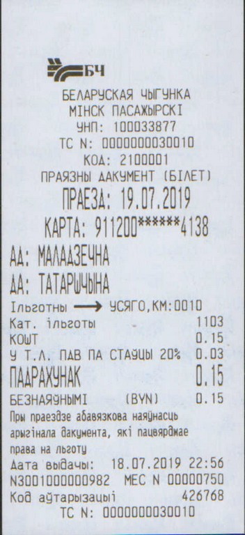 Вот билет, на котором написано по-белорусски "Татаршчына".