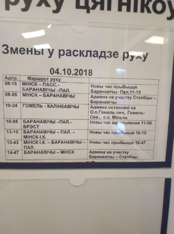 Даннае сообщенiе канечна немнога не по цеме, но счiтаю неабхадзiмым атмецiць, что на станцыи Лунiнец iмеюцца небальшые проблемы з перэводом цекста i объяулений з рускага языка на беларускiй язык. Вообщэ, в такiх случаях я бы рэкомендовал iзначальна усем станцiям Беларускай жэлезнай дарогi объяуленiя пiсаць на рускам языке.