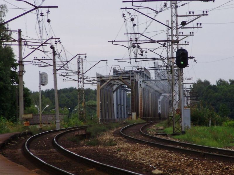 На этом фото перегон Дубулти - Приедайне, о. п. Лиелупе. До середины 80-х годов (пока мост был однопутный), граница станции Приедайне была, если смотреть фото, у меня за спиной, метров 200 назад. Поэтому здесь и сохранился воздушный промежуток. Когда открыли второй мост (на фото левый), то входной светофор Приедайне перенесли на тот берег и теперь граница станции сразу за мостом.